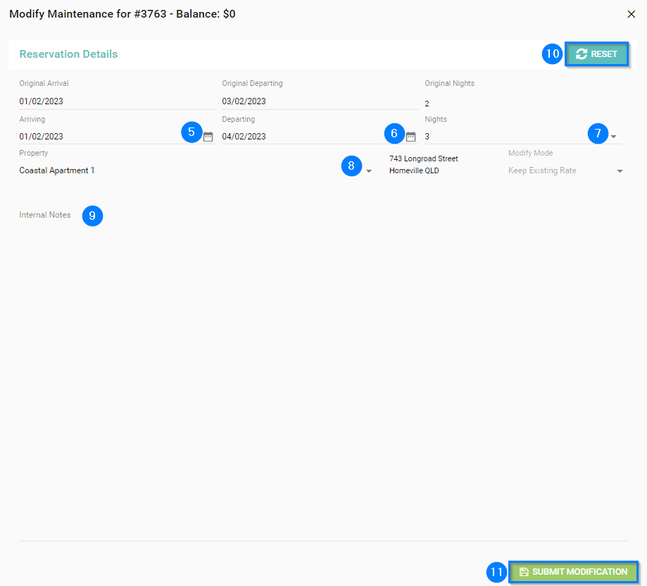 - Internal Notes - Type in the box here if you would like to add Internal Notes to the reservation regarding this modification