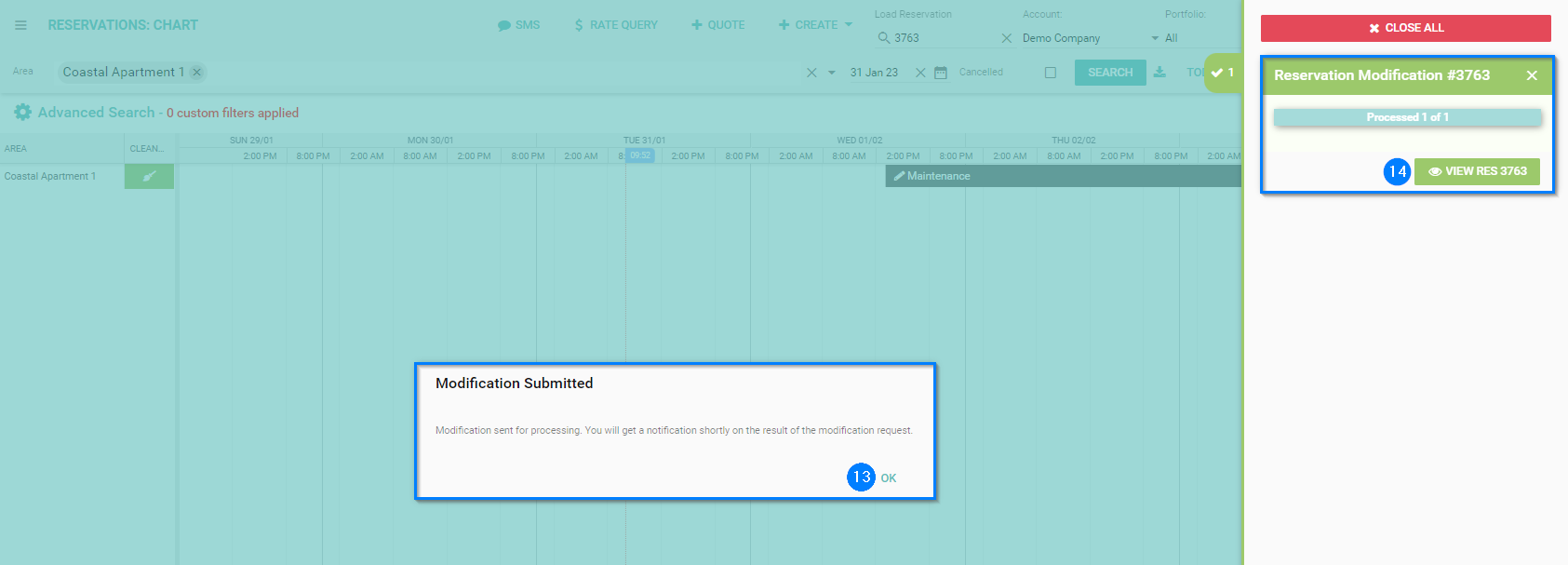 Handy tip: Dragging the start or end date of the Maintenance Block or moving the Property to another Area on the Chart, will take you directly to the Modify Maintenance screen