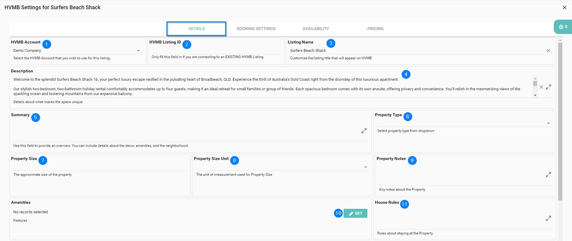 - Listing Name - The name of your listing will automatically feed from your main listing settings if you have used the 'Copy Fields to OTA' tool, however you can also override the listing name here manually. This will be the Property Name that will display in HVMB searches