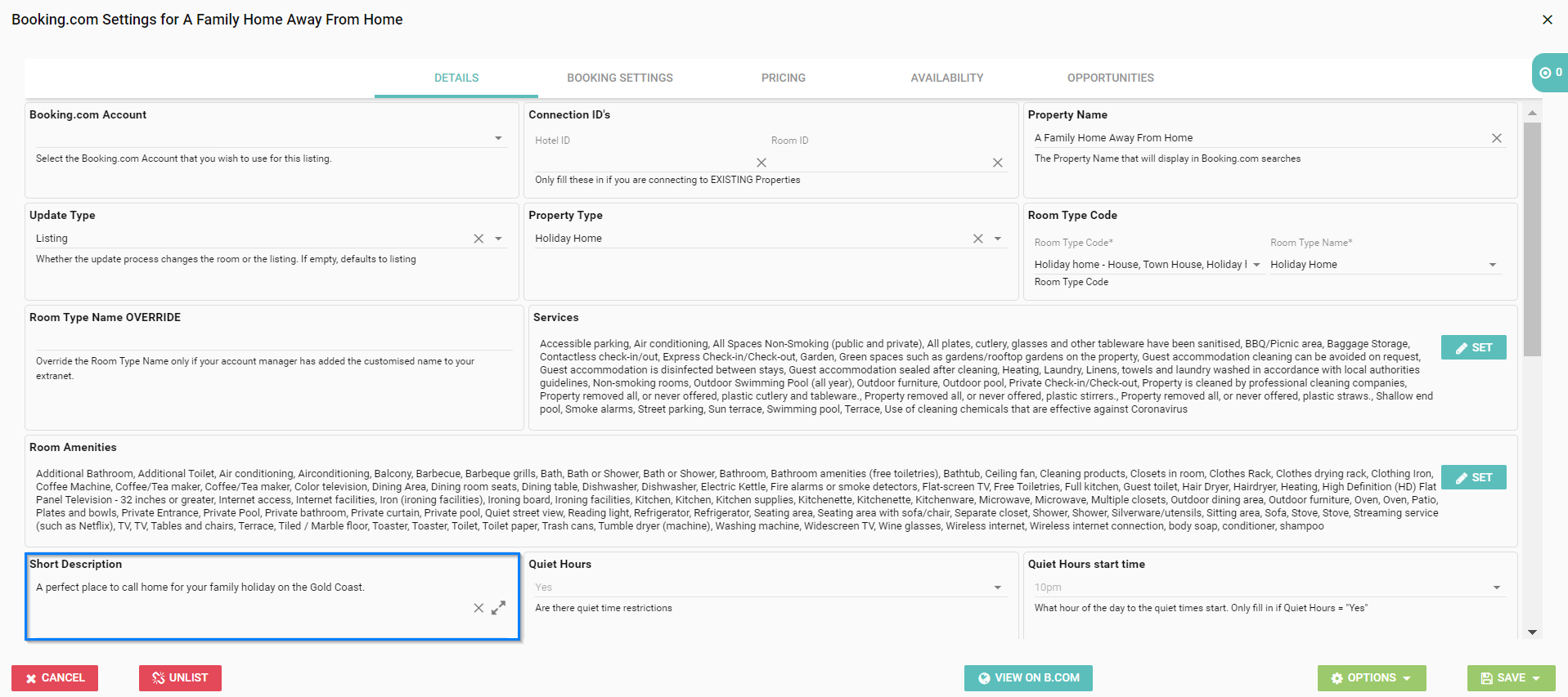 Homhero - Booking Engine > Listings > Booking.com Listing > Details tab > Short Description