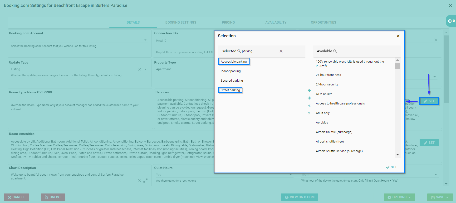 Homhero - Booking Engine > Listings > Booking.com Listing > Details tab > Services