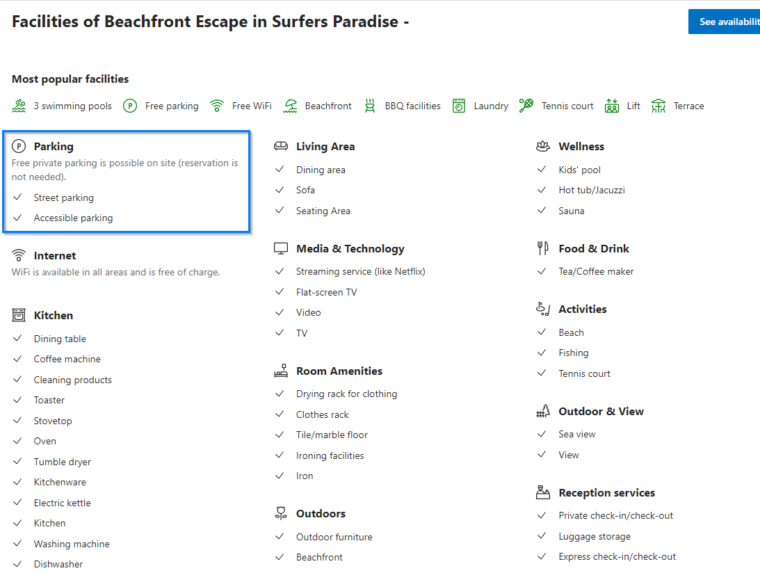 You will notice that 'Parking' is not available as a Feature to be mapped via the MANAGE Features page in Homhero. However, you can add Parking to the 'Services' section in your individual Booking.com Listing Settings instead. You do have the option to select one or multiple Parking services to feed to Booking.com. I have attached an example of where this is setup in Homhero and what this looks like online.
