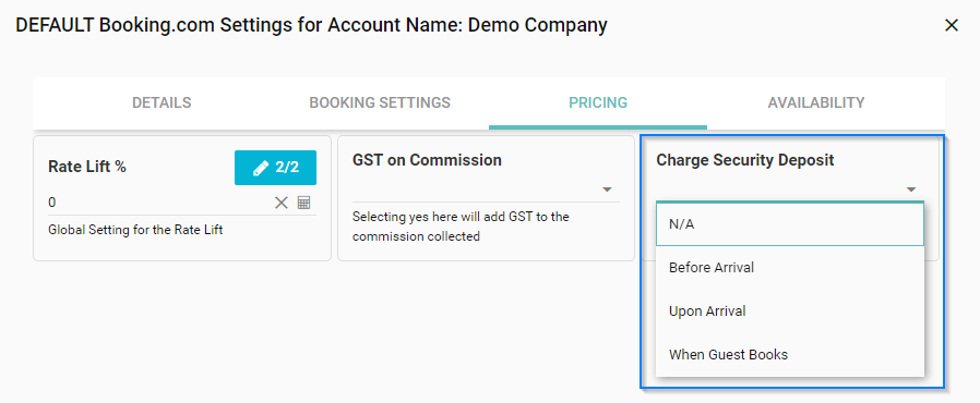 - Security Deposit (The guest will need to pay this at time of booking) This type does not feed to Booking.com