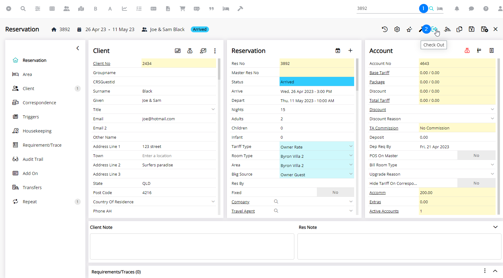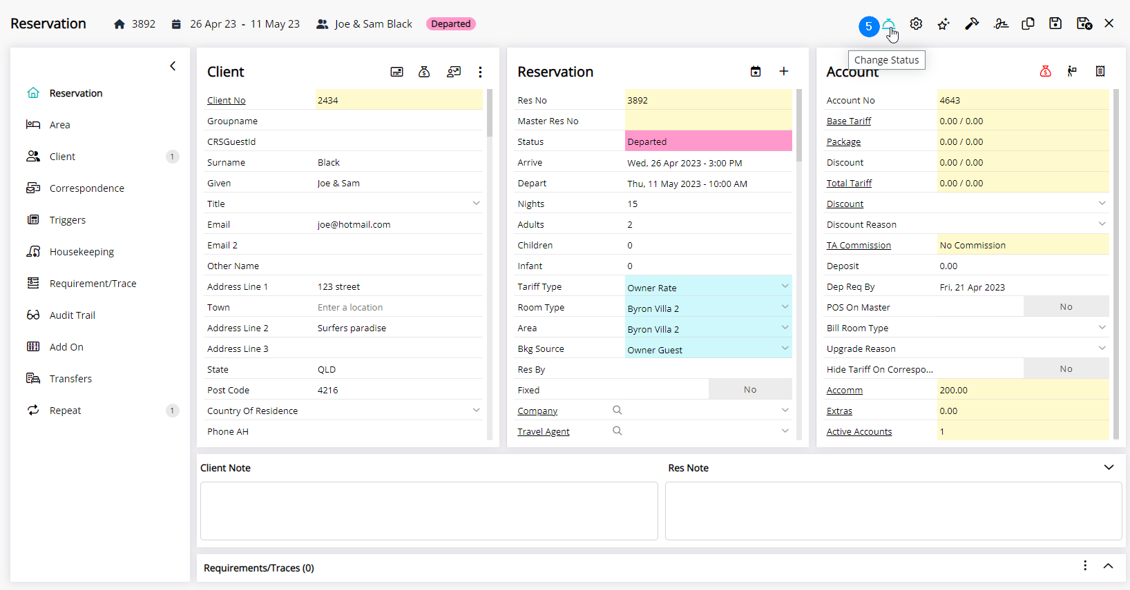 - Once the reservation has updated to Departed, click the Change Status icon to update the booking to Unconfirmed