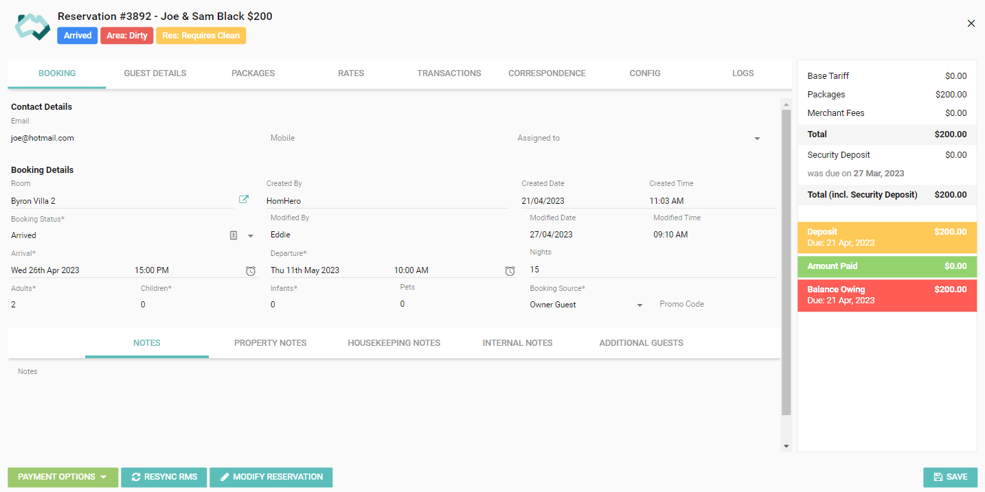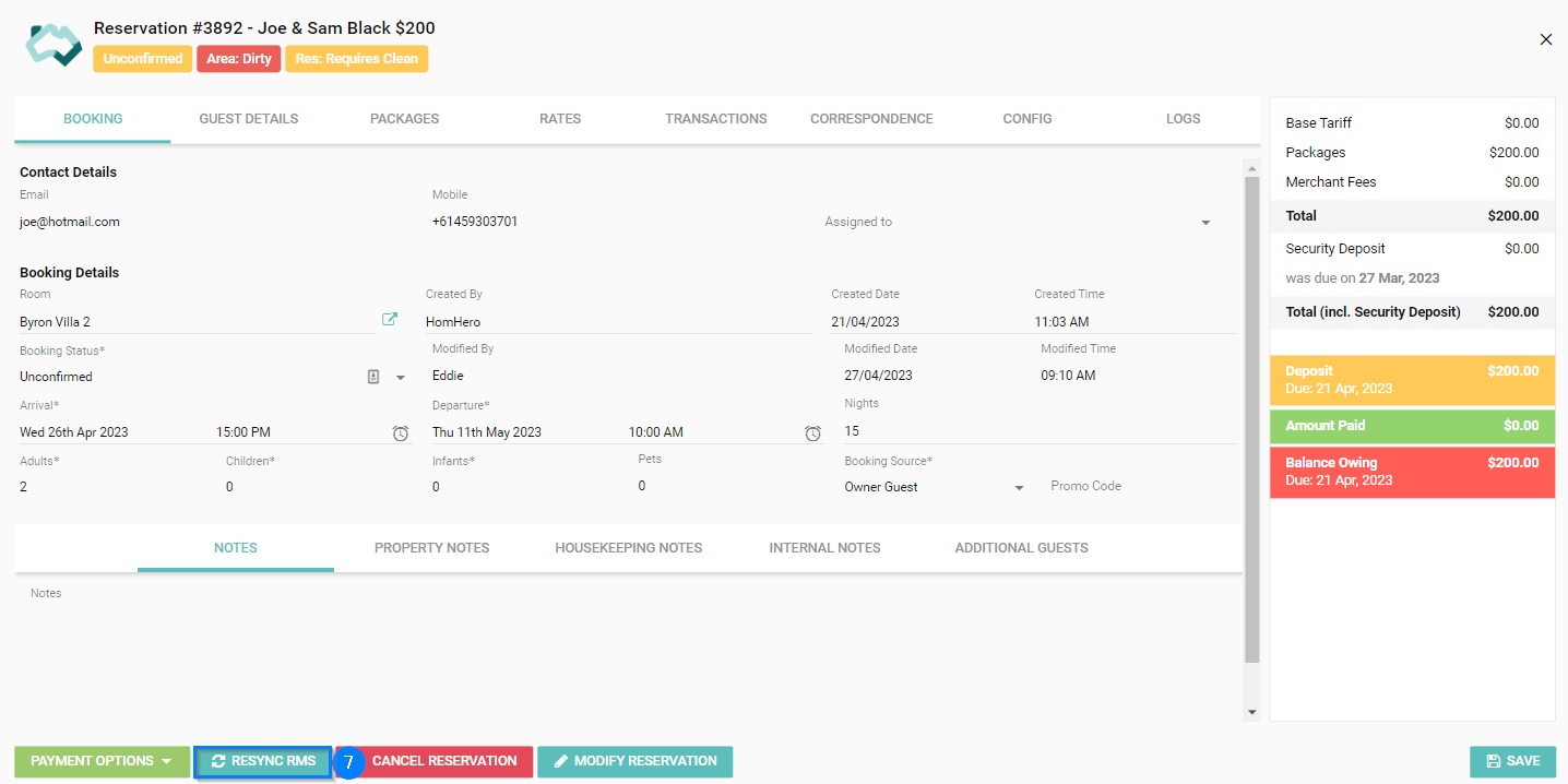 - Head back to Homhero, open the reservation and click Resync RMS. This will sync the changes through from RMS and update the reservation to Unconfirmed