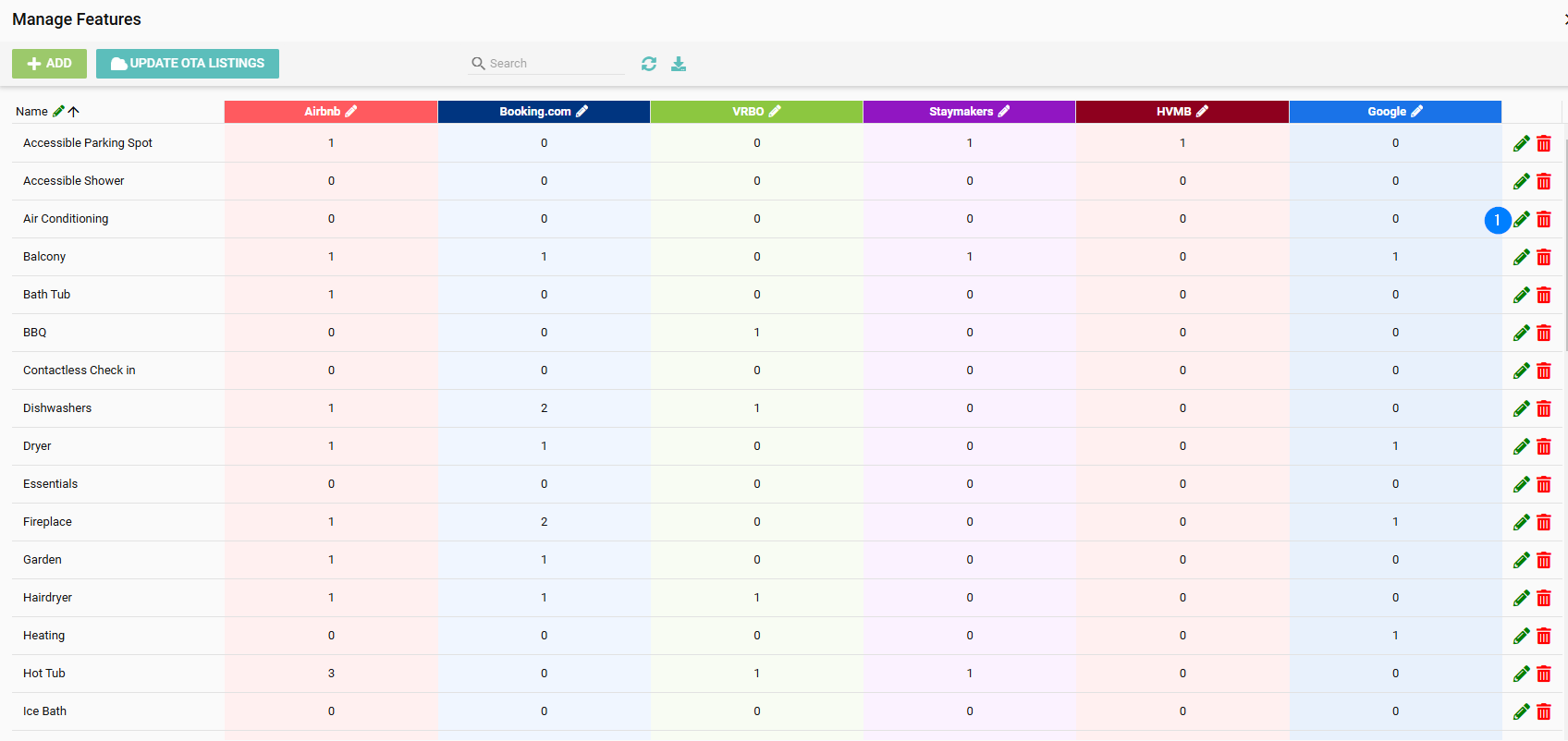 - On the Manage Features page, click the edit pencil next to the feature you want to map. For this example we will use the ''Air conditioning'' feature.