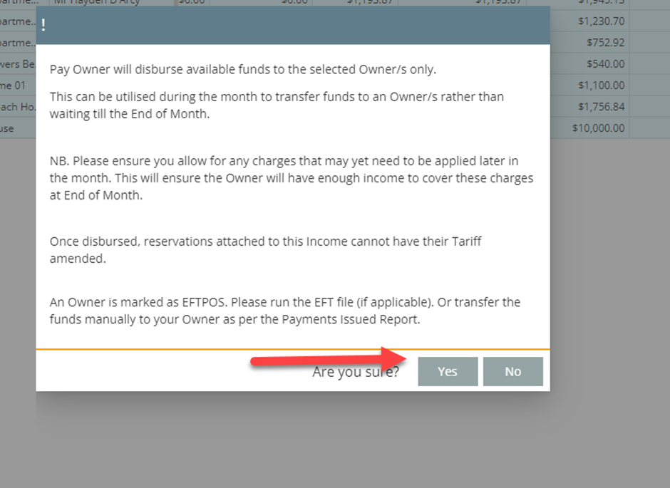 Run a Debtor’s Ledger to make sure there are no unbalanced bookings as any booking with a balance (credit or debit) will not pay out to the owner. This report should be checked once a week throughout the month as this will limit the amount of work required at mid-month and the end of the month.