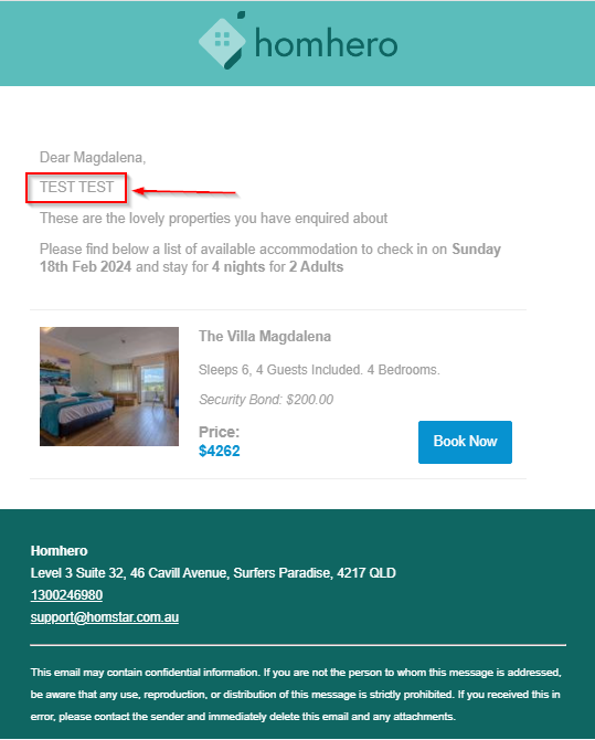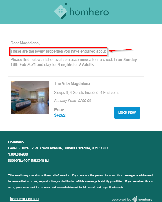 This email is hardcoded and contains a salutation "Dear First name" and a simple text message; "Please find below a list of available accommodation to check in on XX/XX/XX and stay for XX nights for X Adults".