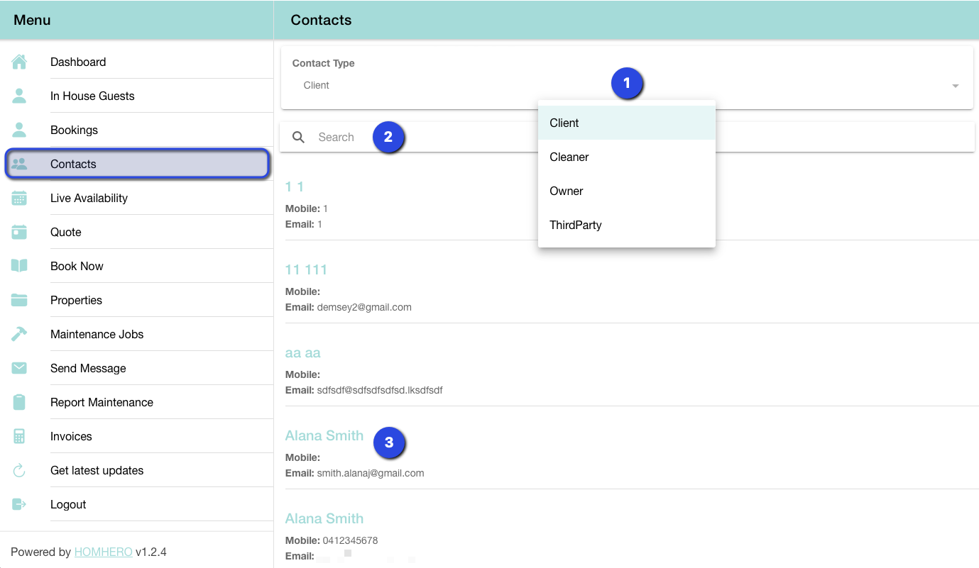 - Contacts will provide all contacts of all guests/owners/staff etc; that are in Homhero.