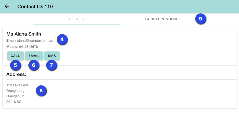 - Click the Correspondence tab to view all previous correspondence with the contact.