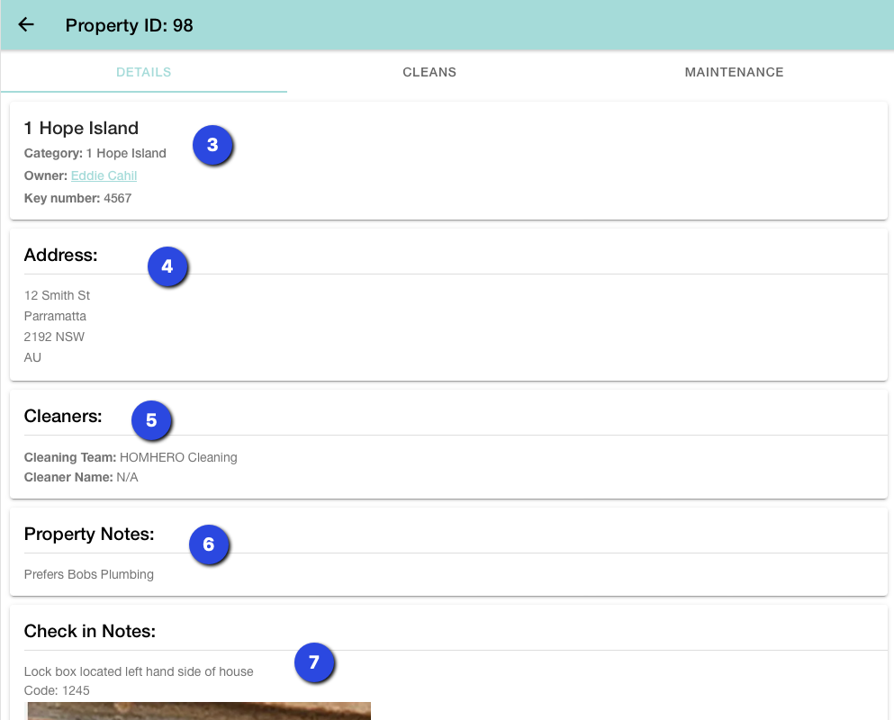 The Property name, Status of the property and Date of the maintenance job is shown at the top.