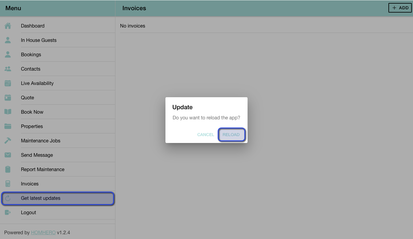 Please ensure you update your online portal, as Homhero is always making improvements. You will see an icon next to the menu for when you need to update. To update, select Get latest updates in the side menu and then click RELOAD.
