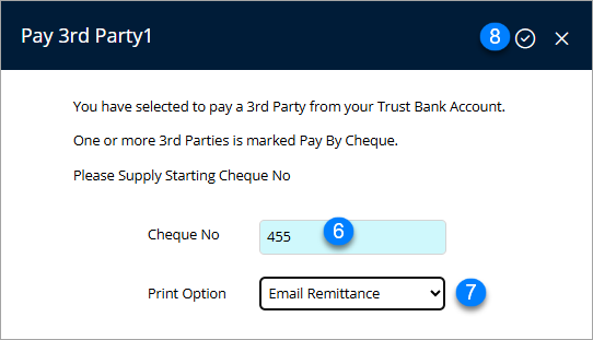 - If prompted enter the Cheque Number 999. This does not mean that you will issue any cheques. It is just referring to if there any owners that have marked cheque as their payment option