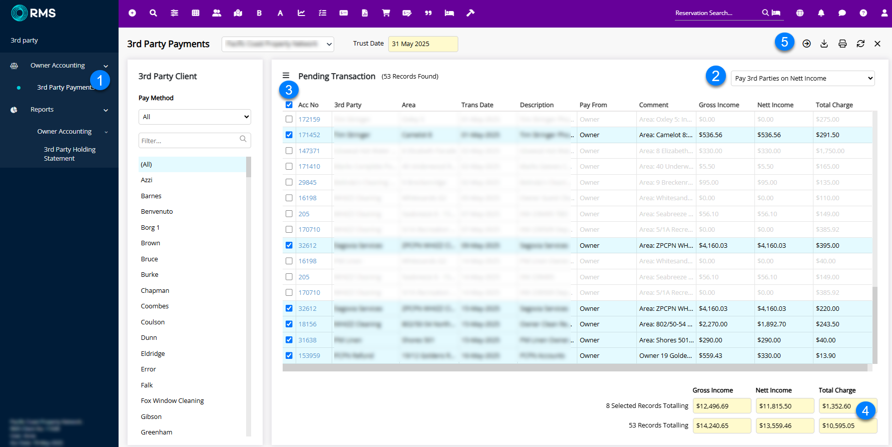 Make sure “Pay 3rd Parties on Nett Income” is selected (the wording may vary slightly depending on your RMS version). This ensures payments are only made from the funds available in the owner's account — it won’t pay 3rd parties from funds set aside for management fees still owed to your agency