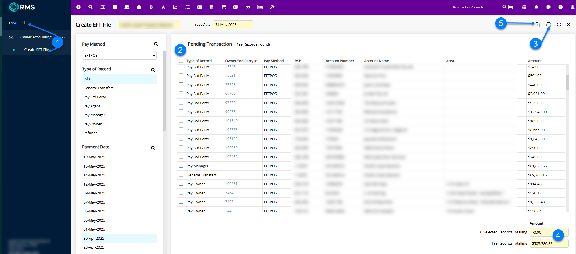 Ensure there are no red lines. If there are, you will need to update the Bank Account details for this line. To do this Click the Owner/3rd Party ID number to take you to the Owners bank account section of the incorrect account details. Once this is completed and there are no other corrections to make. - Click Create EFT File or the Up Arrow depending on the version of RMS
