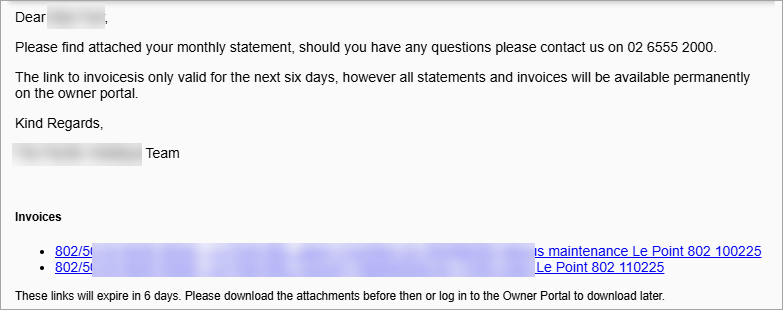 Owners will receive the email explain to them that the link to the invoices only lasts for 6 days. However, they can always view the invoices in the owner portal as well as all End of Month statements.