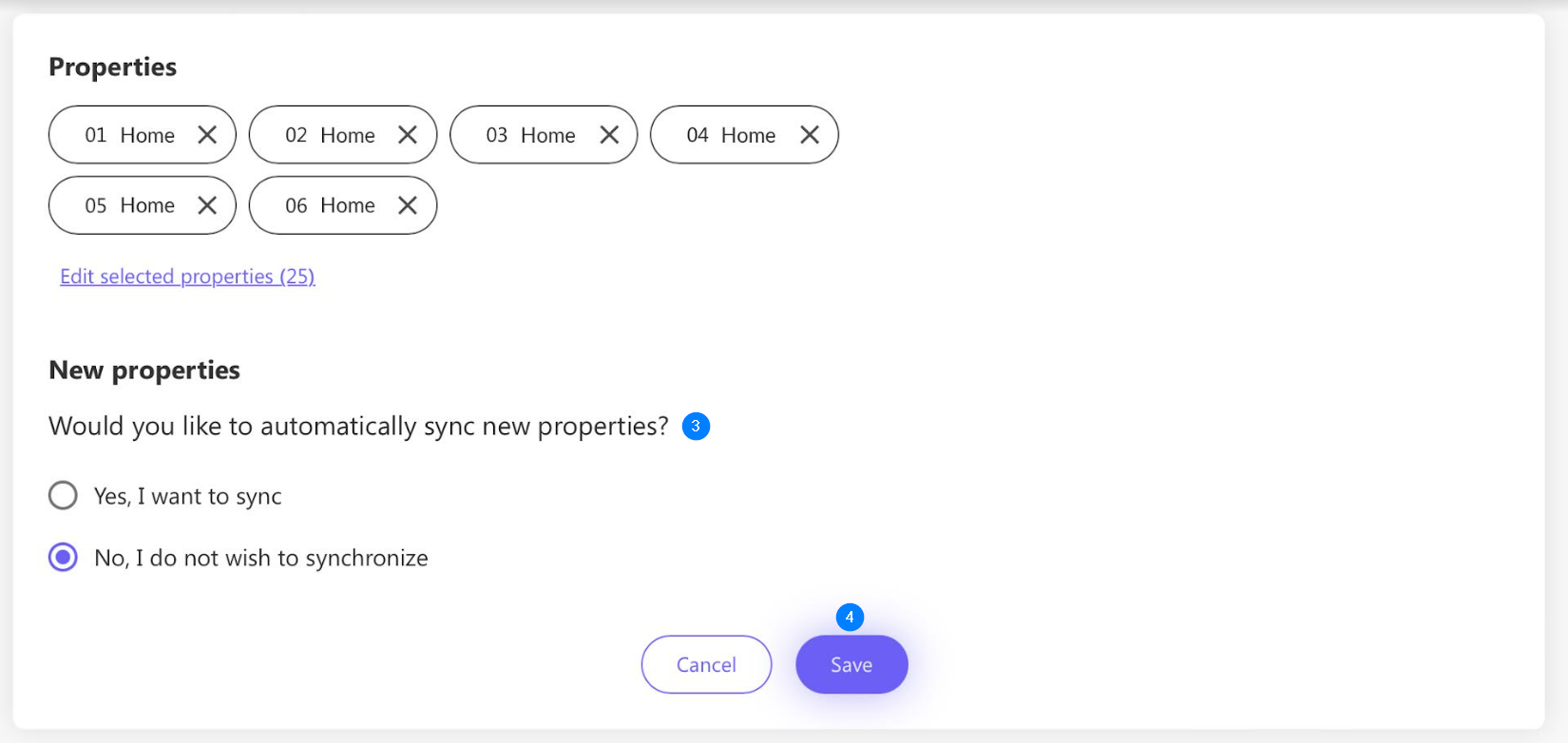 - Would you like to automatically sync new properties? Select Yes or No