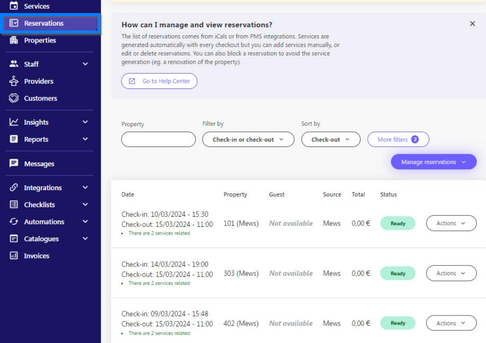 Doinn has the most complete scheduling automations in the market. At the moment it is possible to create services based on reservations length, reservations number of guests, distance from previous reservation, distance to next reservation. Moreover you can use tags such as “Clean Not Required” and decide complex combinations of services during the reservations itself.