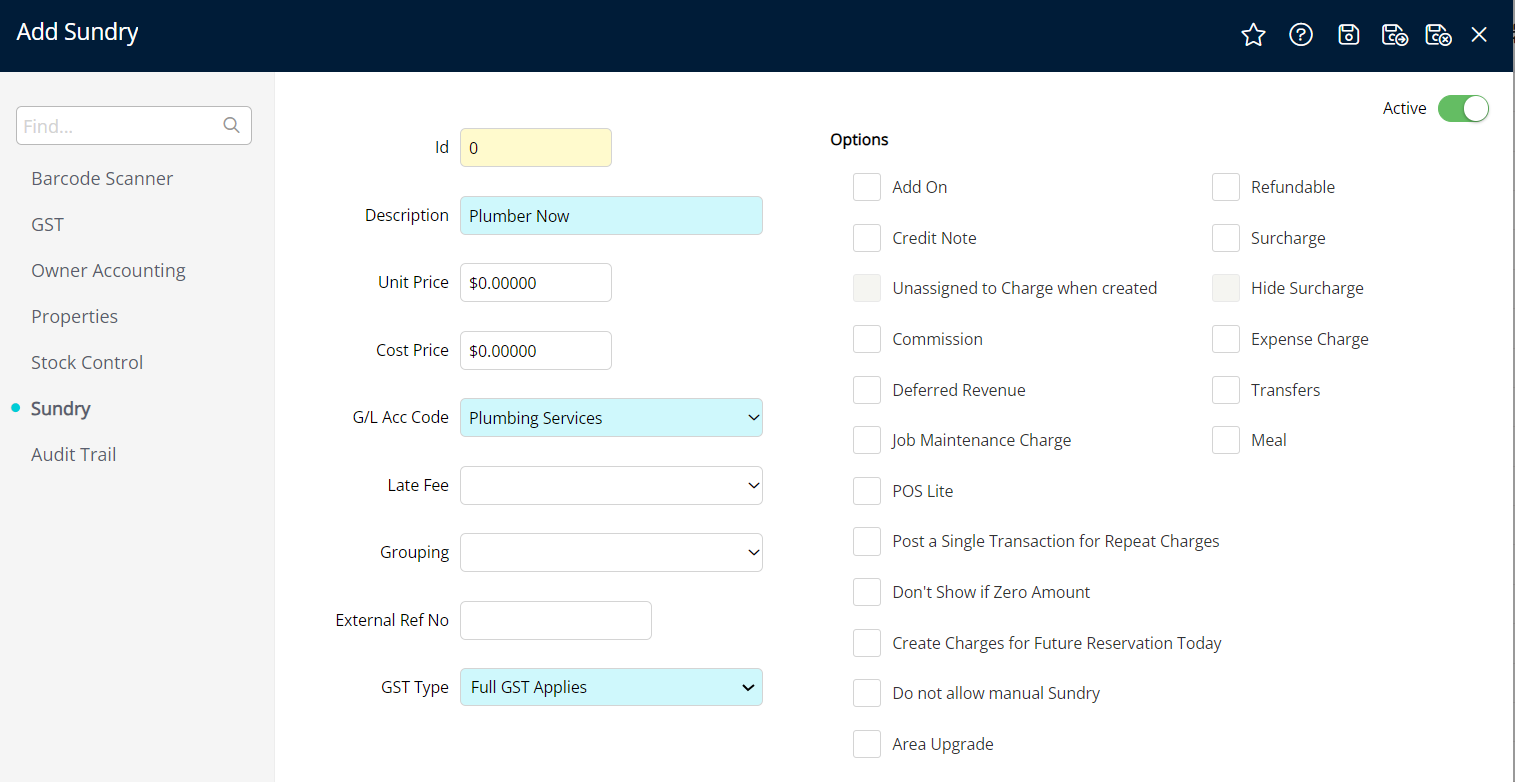 Type Sundry in the Menu and select Setup + Accounting + Sundry + Select
