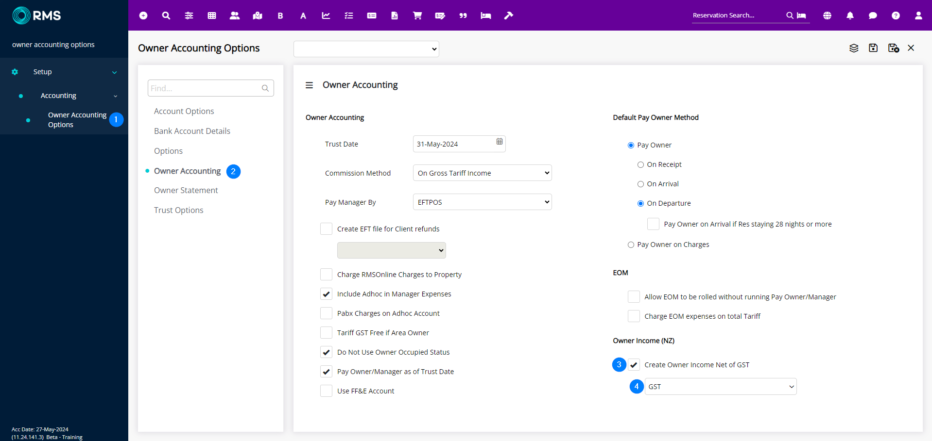 - Search and open the Owner Accounting Options from the Menu Search