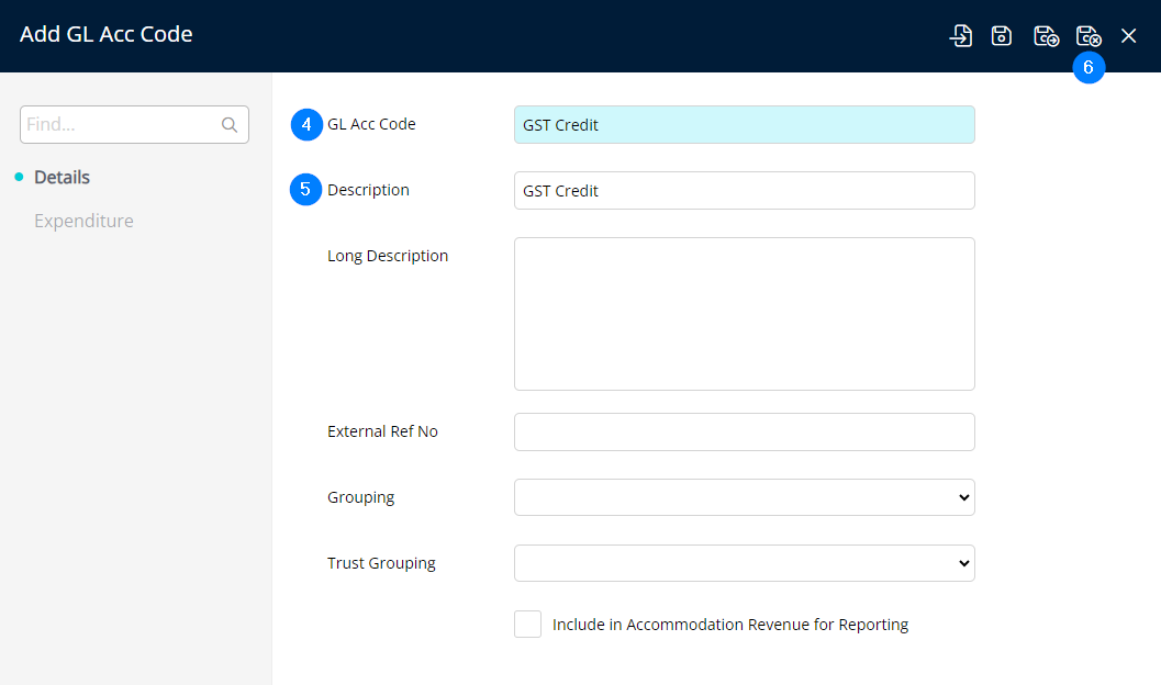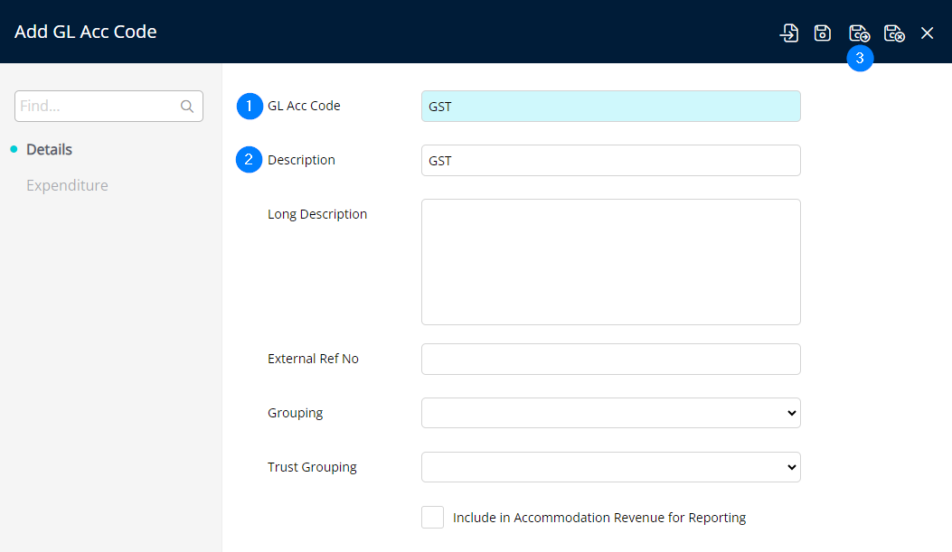 Add 'GST' GL Account Code - GL Acc Code = GST