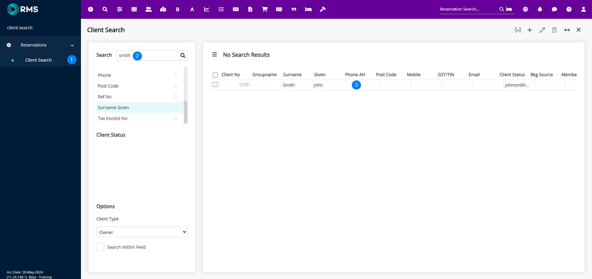 - Search and open Client Search from the Menu Search