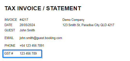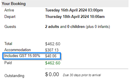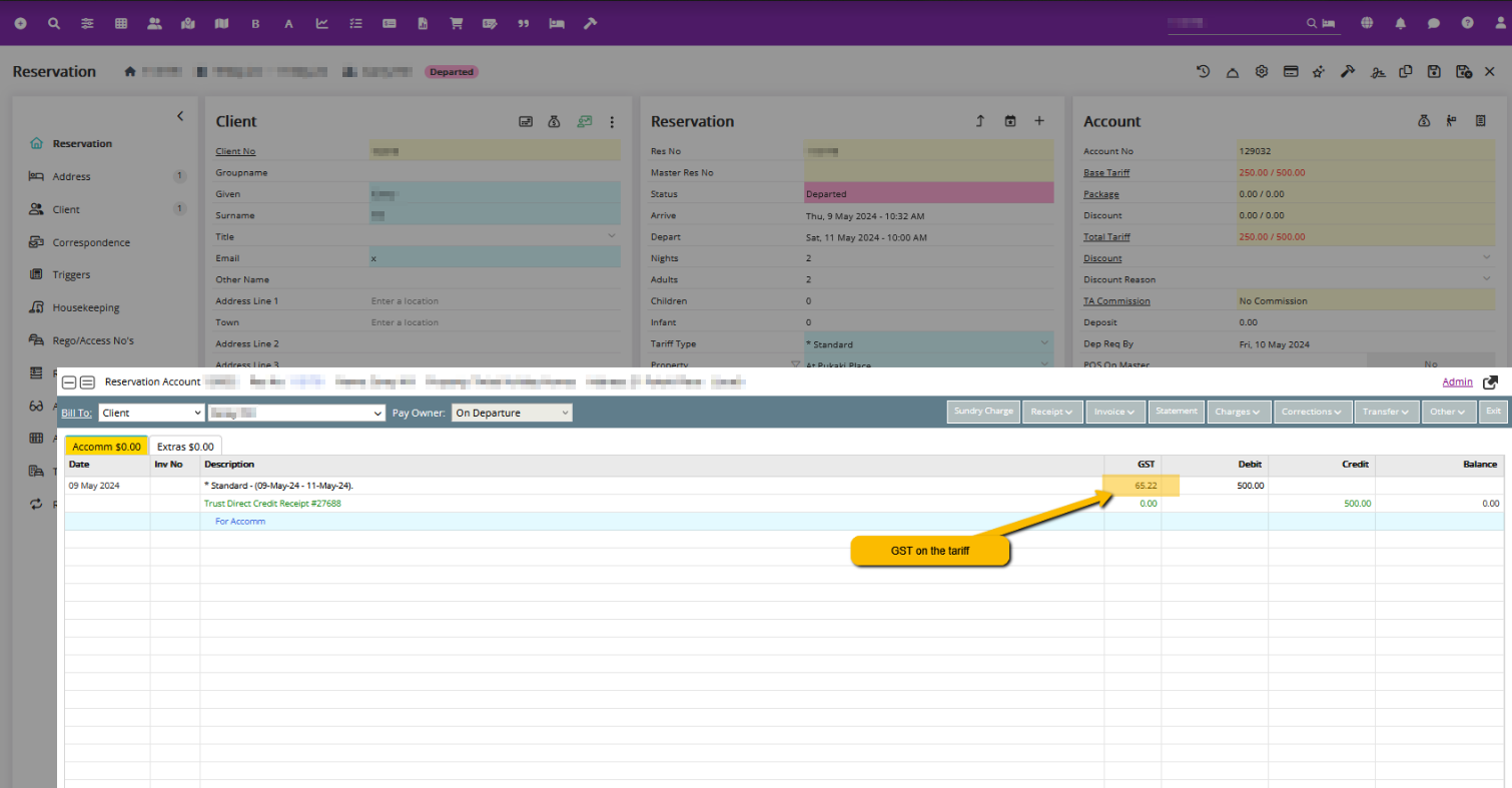 Below is an example of the GST being split out on a reservation: